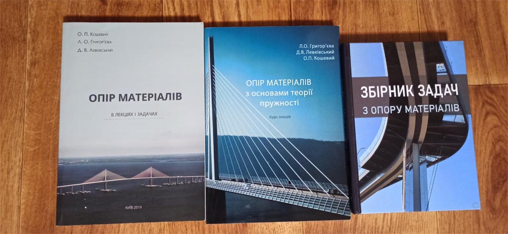 Опір матеріалів в лекціях і задачах: Навчальний посібник / О. П. Кошевий, Л. О. Григор'єва, Д. В. Левківський. - К.: КНУБА; Кам'янець-Подільський: ТОВ "Друкарня "Рута", 2019. - 340 с.